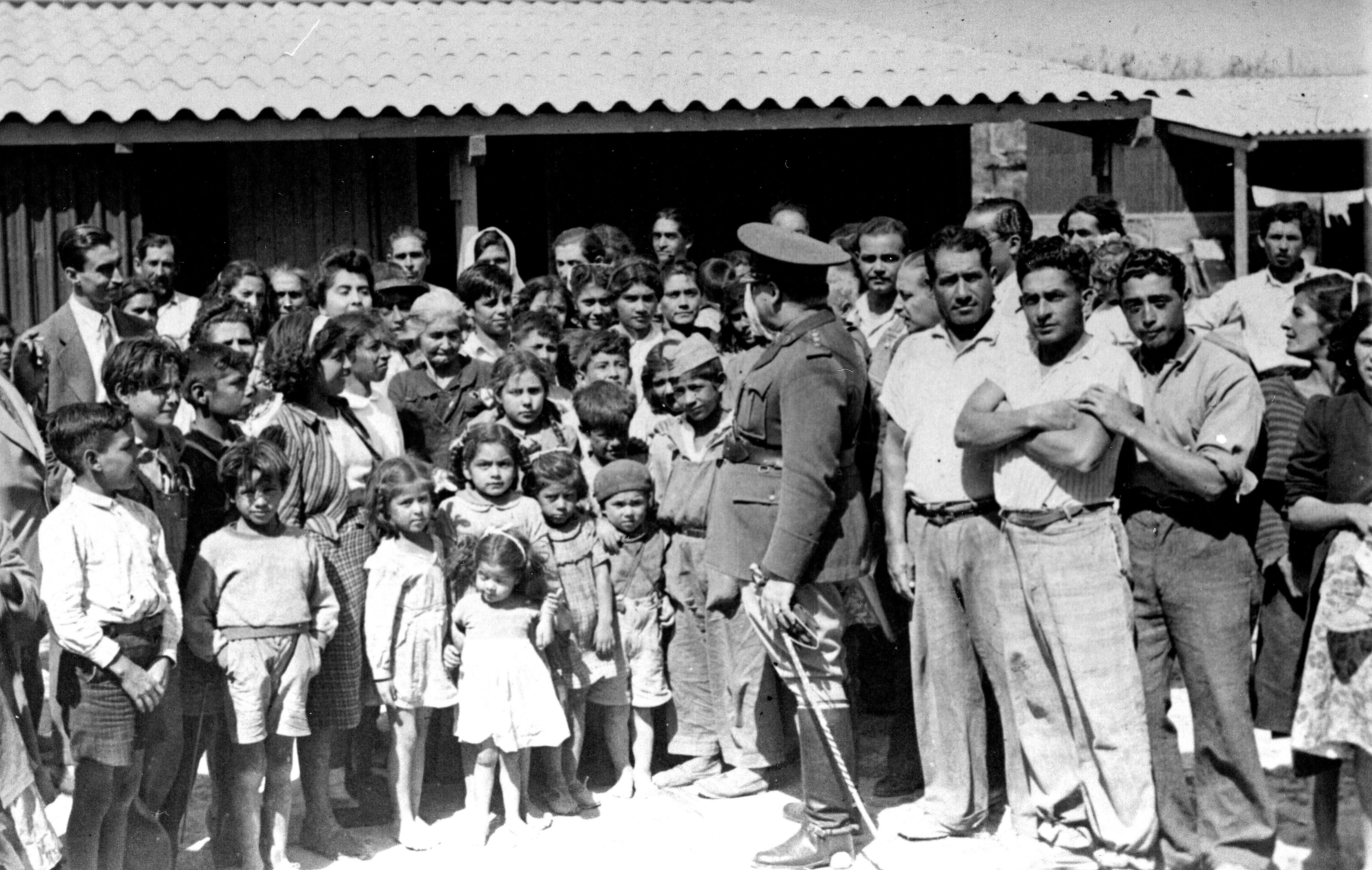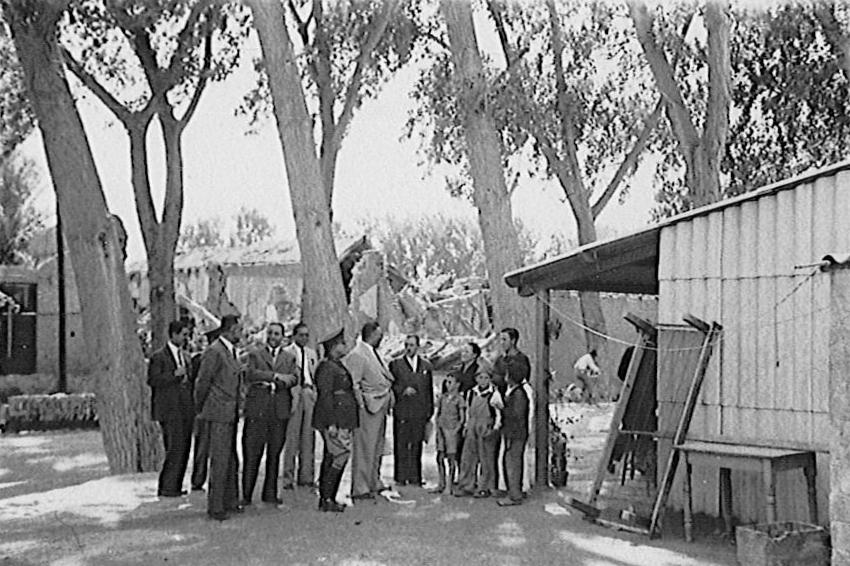 La primera secuencia es de abril de 1944, registros de un giro del entonces interventor Sosa Molina por viviendas de emergencia. Hay tres fotos, dos de las cuales usé en el libro. La primera es de un rancho improvisado en Albardón, y la familia que vivió allí. La segunda es de una vivienda en uno de los barrios de emergencia más grandes, creo que el Capitán Lazo, con algunos de los nuevos residentes. La tercera es de una vivienda en un barrio de emergencia más chiquito, construido entre árboles en un terreno más estrecho, no la gran extensión del Capitán Lazo. Esa tercera es tal vez la menos interesante, aunque reside algún interés en eso mismo. Es notable que la foto del barrio más privilegiado, en términos relativos, es la que menos se ha pensado como escenografía política.
