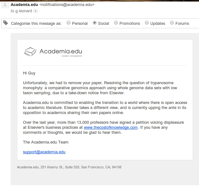 El éxito de este tipo de herramientas online ha debido ser cuantioso en los últimos meses, pues una de las publicaciones académicas más importantes, Elsevier, solicitó recientemente —mediante avisos legales— a la red social académica Academia.edu, que debía retirar de Internet miles de artículos que habían sido subidos por sus respectivos autores a dicho sitio. A Academia.edu no le quedó más remedio que actuar en consencuencia, pues lo contrario hubiese provocado una serie de acciones legales con acusaciones de pirateria que habrían costado mucho tiempo y dinero. A pesar de que Academia.edu debió de plegarse a los requerimientos de Elsevier, lo hizo a través de notificaciones a sus usuarios en los que dejaba en claro que se retiraban sus textos debido a avisos legales, y no por errores o políticas de la misma red social.