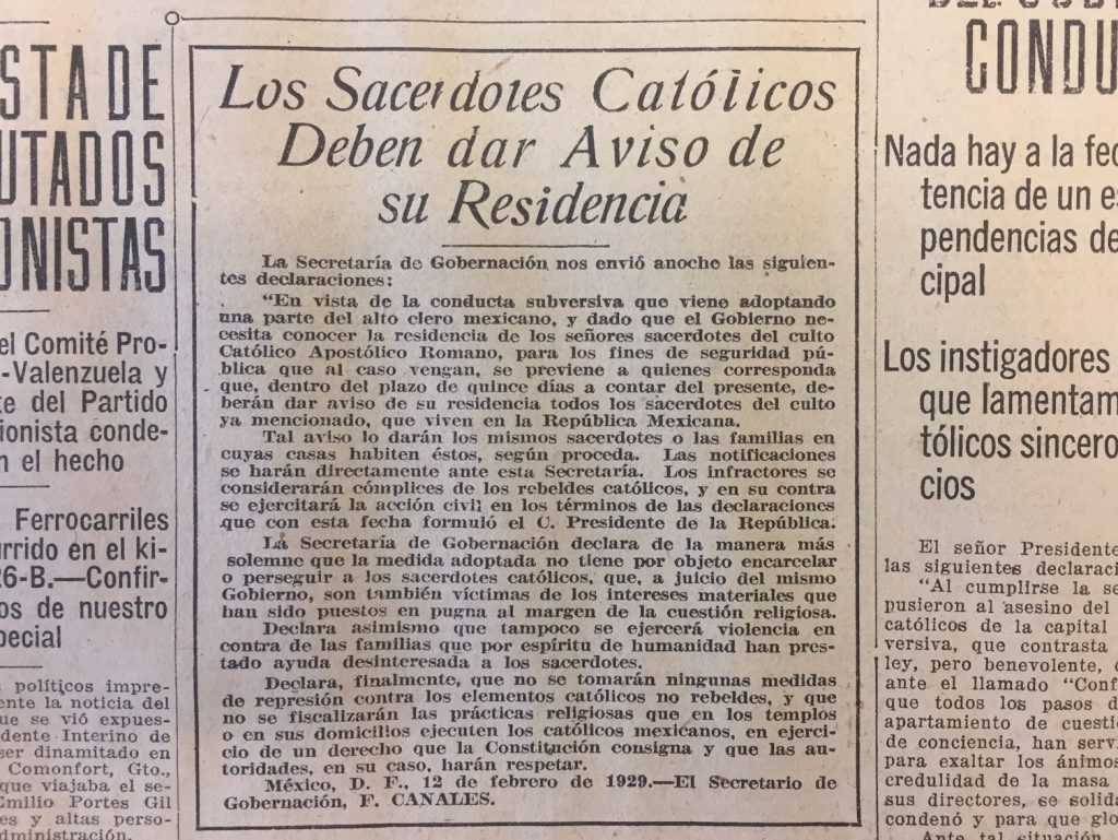KP: Following on from this, I began researching the political context in Mexico City and Rome in which the Relación became meaningful. We had a state census of Catholic priests created just four months before the end of the Cristero War (June 1929), yet this was a conflict whose origins were to be found in priests’ very rejection three years earlier of another state-mandated registration project. There had been in the middle of the Cristero War one or two regional or state-based military-enforced priest registrations and relocation sweeps, and this made the volunteered 1929 registrations even more intriguing. A lot of things had to happen to get these priests to sign up for what may have looked like a trap at the beginning, even though it was really the means to move toward reconciliation and peace. It’s telling that when I went to the archive and searched through the newspapers the most difficult task wasn’t finding Relación-related articles themselves, though this was actually a pretty grueling exercise by itself. The hard part was consolidating the dozens of newspaper reports that covered these public declarations and learning to read these back-and-forth responses as priests and officials at the time would have read them, as signs, clues. Once I was familiar with the “code” of these public pronouncements it was easier to capture the link between the church-state truce of 1929 and the Relación. Basically the Relación provided a way for the regime to distinguish between loyal, censused priests and rebel priests, and for “patriotic,” peaceful clergy to stand up and be counted.