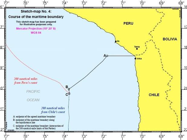La petición del gobierno peruano se sustentaba en afirmar que el límite marítimo debía ser la línea equidistante ya que las 200 millas de cada país se sobreponen (Como se observa en la Imagen)